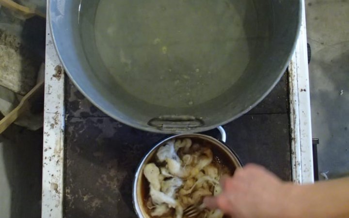 Nejprve jsme vlnu museli vyprat. Ještě předtím je samozřejmě nutné ji ostříhat, což nemusí být vůbec lehký úkol. Záleží to na věku ovce, ale i jejím temperamentu, jak jsme se dozvěděli od slečny přadleny. Teď se však vraťme k praní. Každý díl celkového objemu materiálu je nutné vyprat alespoň patnáctkrát. Teplota vody by měla být taková, abychom v ní udrželi ruce po dobu čištění vlny. Jak jsme s praním daleko rozpoznáme jednoduše podle intenzity zbarvení vody, kterou po praní vyléváme. Po ukončení posledního praní by měla být voda průhledná. Při počátečním čištění je nutné z vlny vybrat větší nečistoty, jako jsou stébla trávy, slámy, různé kudlibabky a podobně. V závěrečné fázi praní jsme použili i březový šampón bez agresivních látek, který praní urychlil. Je ale potřeba počítat s tím, že vlna absorbuje aroma šamponu a poměrně dlouho bude mít vůni, kterou jsme zvolili.