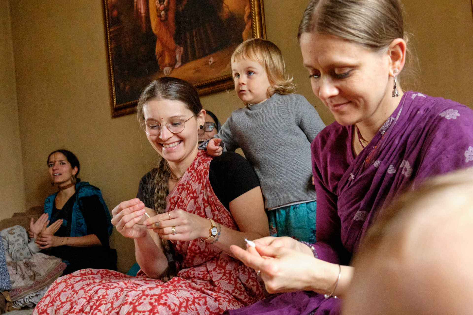 Obřad udílení jména. Dcera Dharaní Dhary dáse a Kámakší déví dásí dostala jméno Ráma-patní (manželka Pána Rámy)