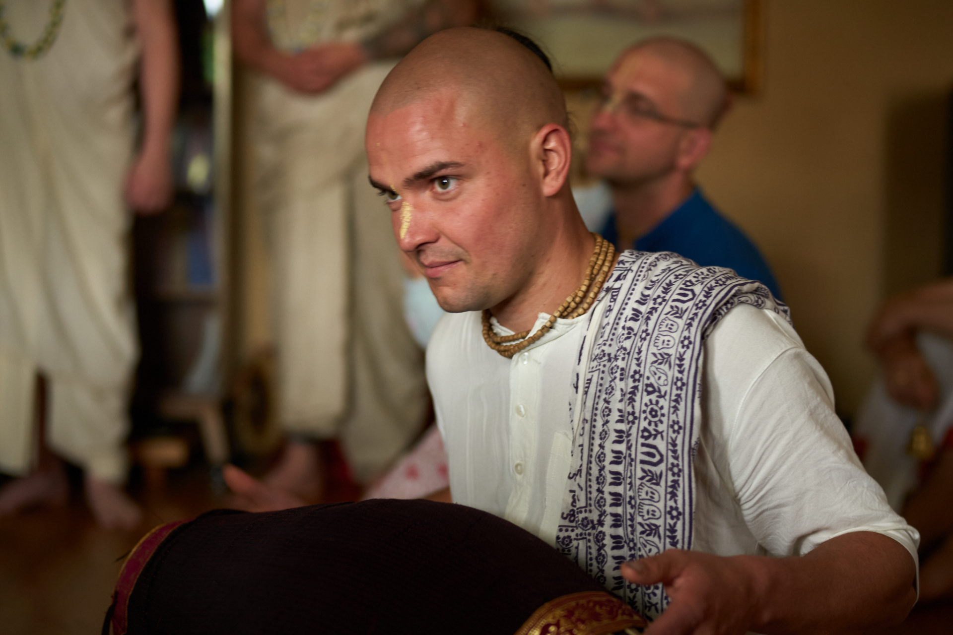Obřad udílení jména. Dcera Dharaní Dhary dáse a Kámakší déví dásí dostala jméno Ráma-patní (manželka Pána Rámy)